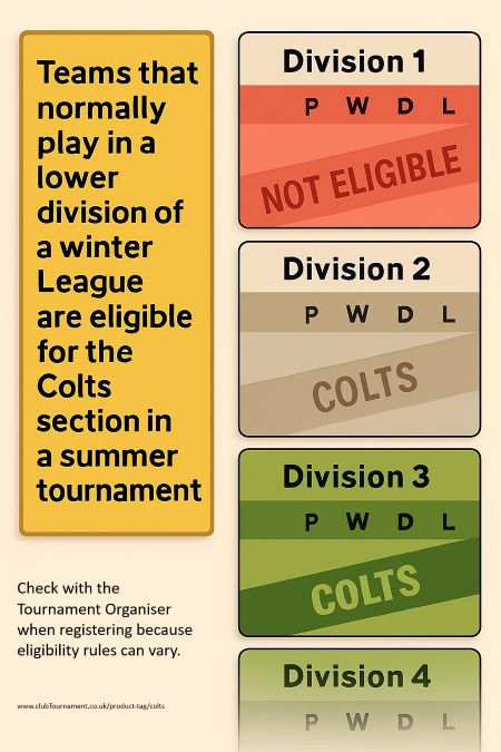 Fun tournaments and festivals for grassroots teams that play in lower divisions of winter leagues. Referred to as Colts Festivals by some Organisers, they are sometimes open to any team not in Division 1. Please enquire with the Tournament organising club to confirm their policy for entering teams. Colts Tournament FAQ.