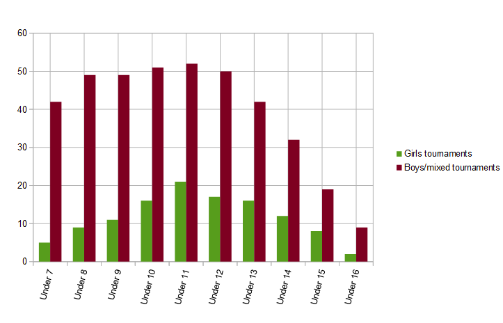 Only 33 of the 61 tournaments listed offer Girls-only age groups. There is a lack of U14-U16 and Youth tournaments listed, especially in Boys/Mixed category. Tournament Directors still deciding what age groups to offer have some real opportunities to fine tune tournament age groups to fill this. To quantify this, the chart shows how many tournaments are listed for each age group (green for Girls-only tournaments; maroon for Boys/Mixed tournaments) :-